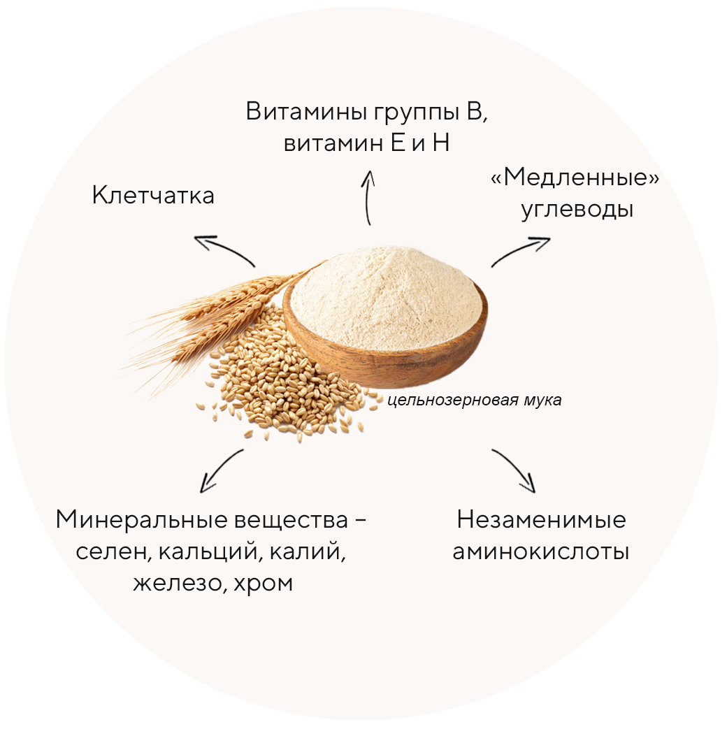 Но мы выбрали именно её, потому что мука из смолотого цельного зерна - это живой продукт, который насыщает организм необходимыми ему витаминами и минералами.