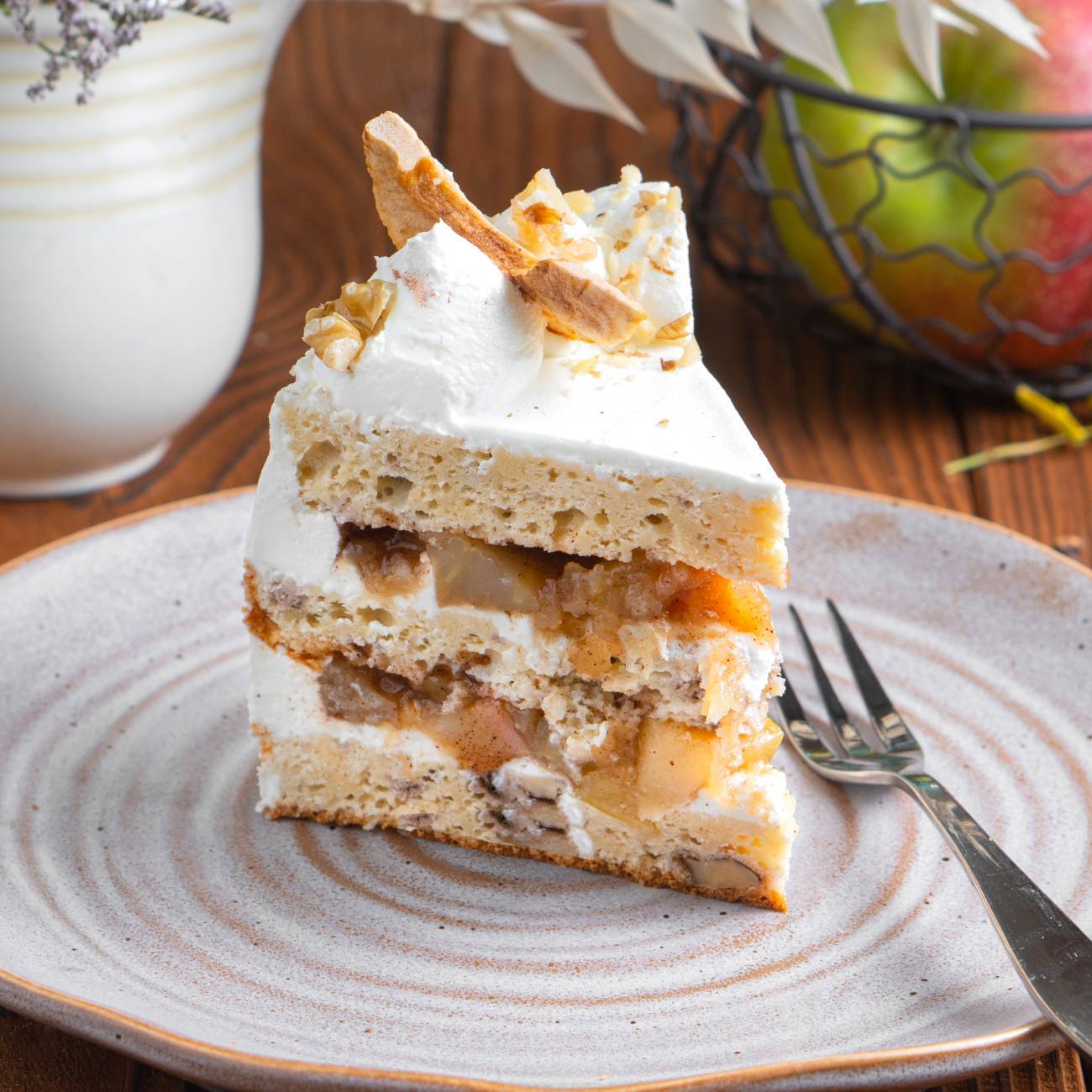 Нежная тончайшая основа не оттягивает на себя слишком много внимания, тягучая яблочная карамель пьянит уютным ароматом, легкий заварной крем придает утонченные нотки, а микс из свежих ягод идеально дополняет этот ансамбль